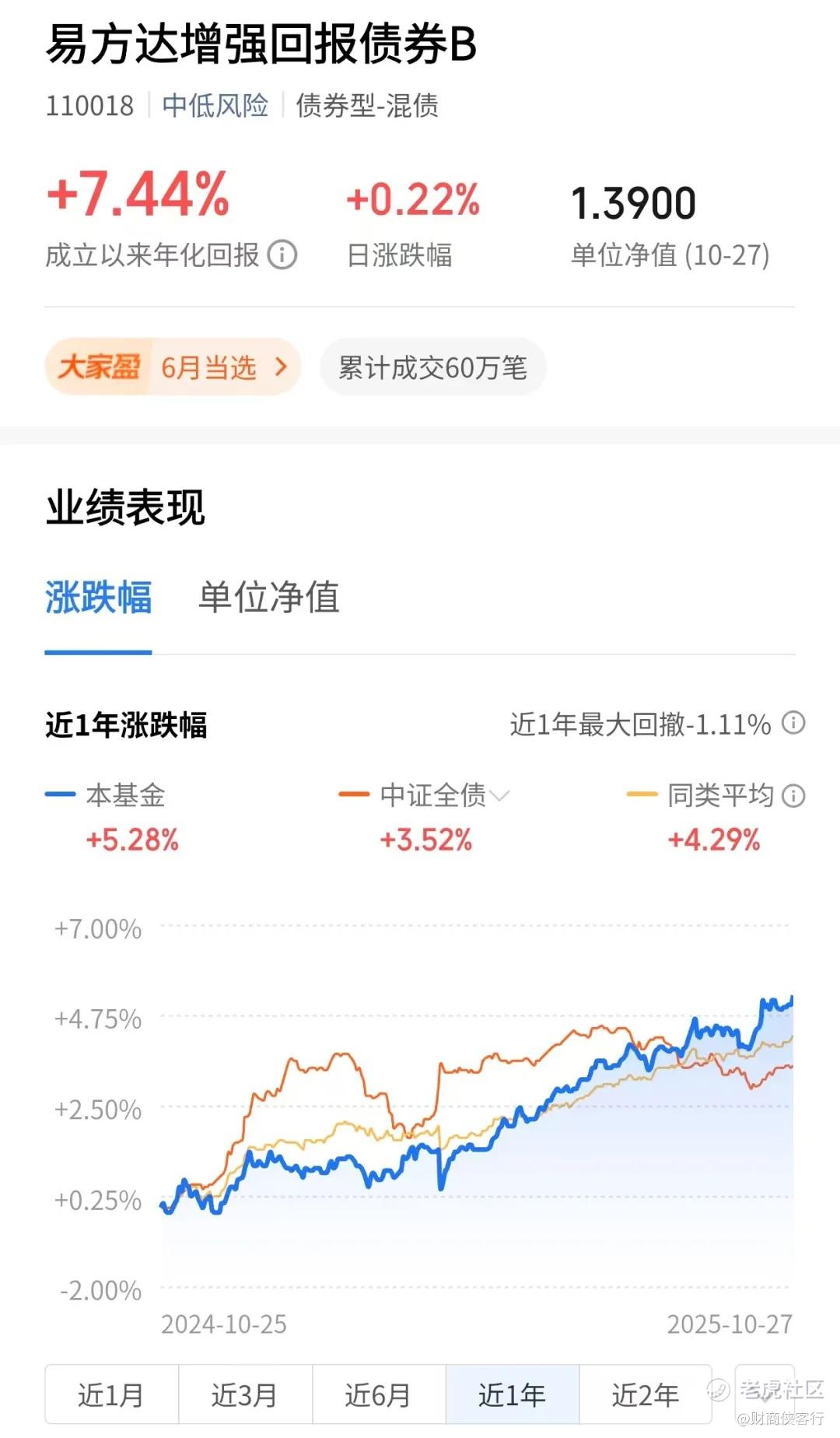 比如这只,易方达增强回报,这波下跌几乎没什么回撤,近1年回报达到5.28%,关键是,最大回撤才-1.11%,持有体验很好。
