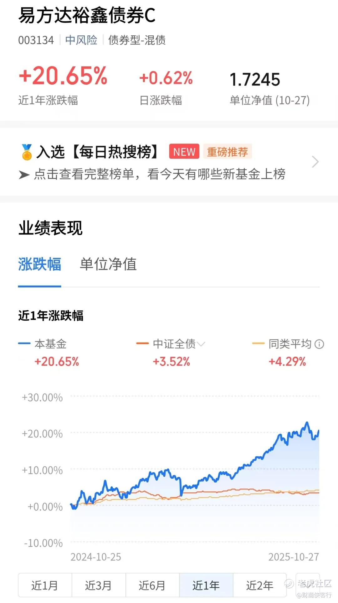 还有一只准备入手的,易方达裕鑫债券C(003134),比易方达增强回报更进取一些,近1年回报达到20.65%,最大回撤才-6.47%。在最近一年的行情里,这样的“风险收益比”真的是非常能打。