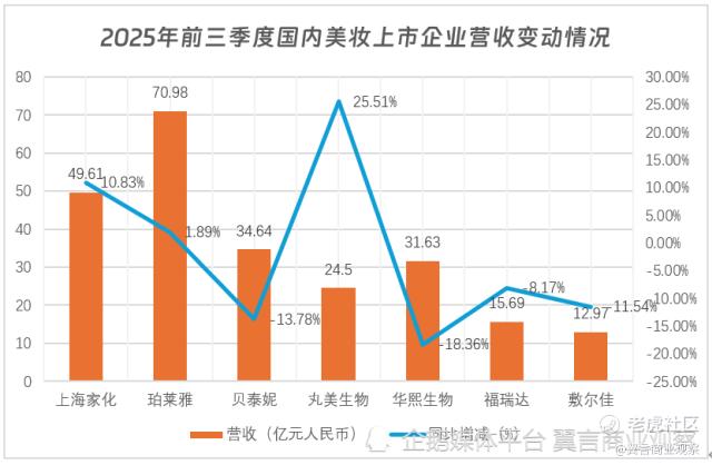 近日,丸美生物(603983)发布2025年三季报。数据显示,丸美前三季度营收24.5亿元,同比增长25.51%。值得注意的是,横向对比珀莱雅、上海家化、贝泰妮、华熙生物、福瑞达、敷尔佳等国内头部上市美妆企业的营收增速变化,丸美的营收同比增速第一;归母净利润2.44亿元,同比增长2.13%。