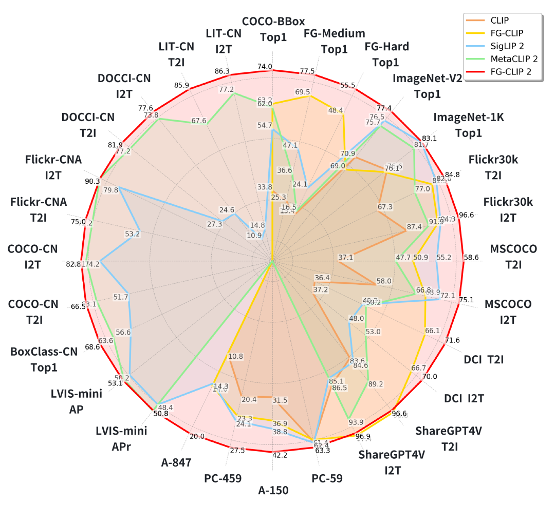 视觉信息无国界,但理解往往受限于语言。FG-CLIP2是全球首批在模型底层实现中英双语均衡训练的视觉语言模型。它能像一个真正的双语者,用两种语言的思维去理解图像中的每一个局部细节。