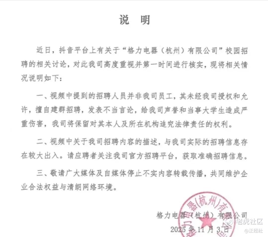 11月3日晚,格力电器(杭州)有限公司通过官方微信公众号发布声明,明确宣布:视频中提到的招聘人员并非该公司员工,其未经公司授权和允许,擅自建群招聘,发表不当言论,给公司声誉和当事大学生造成严重伤害,公司将保留对其本人及所在机构追究法律责任的权利。