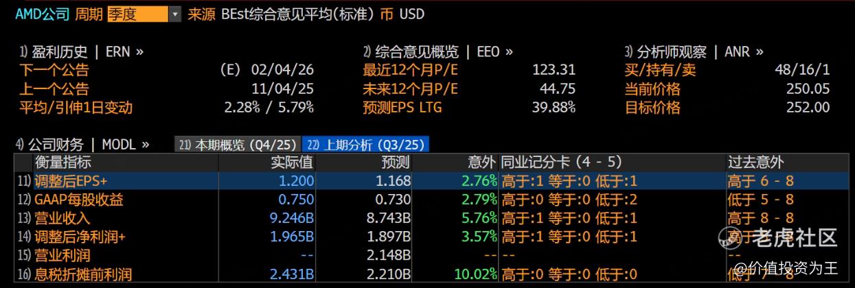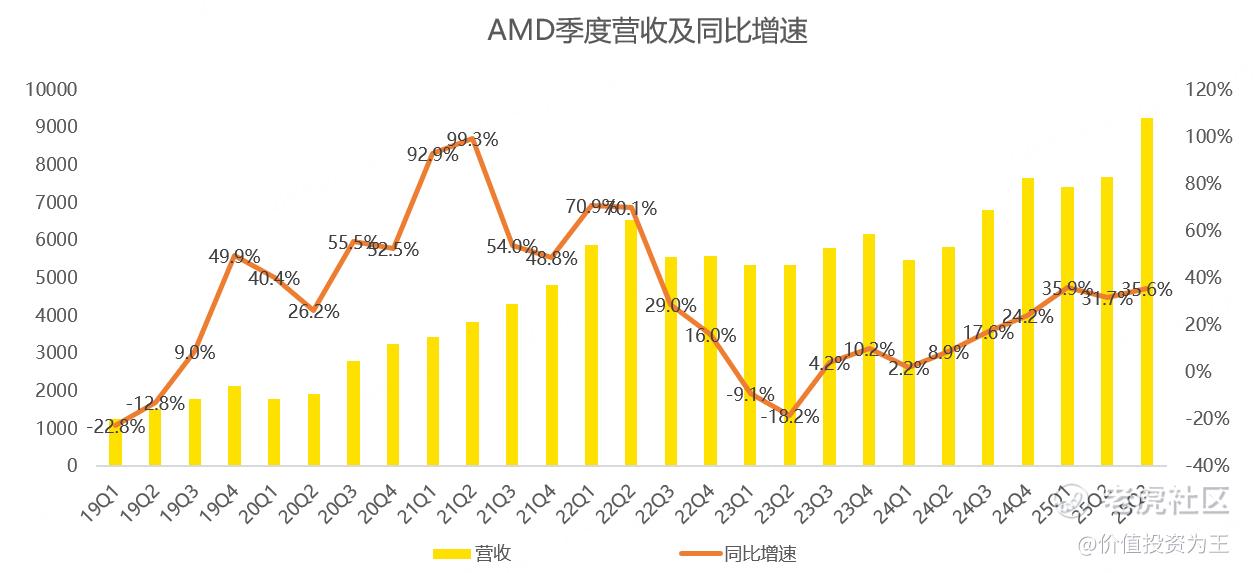 从收入上看,AMD三季度为92.5亿美元,超过分析师预期的87.4亿,同比增长35.6%: