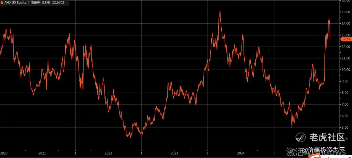 AMD四季度营收指引超过分析师预期的92亿,但盘后股价依然下跌,主要是AMD此前股价涨幅巨大,市销率估值来到历史高位: