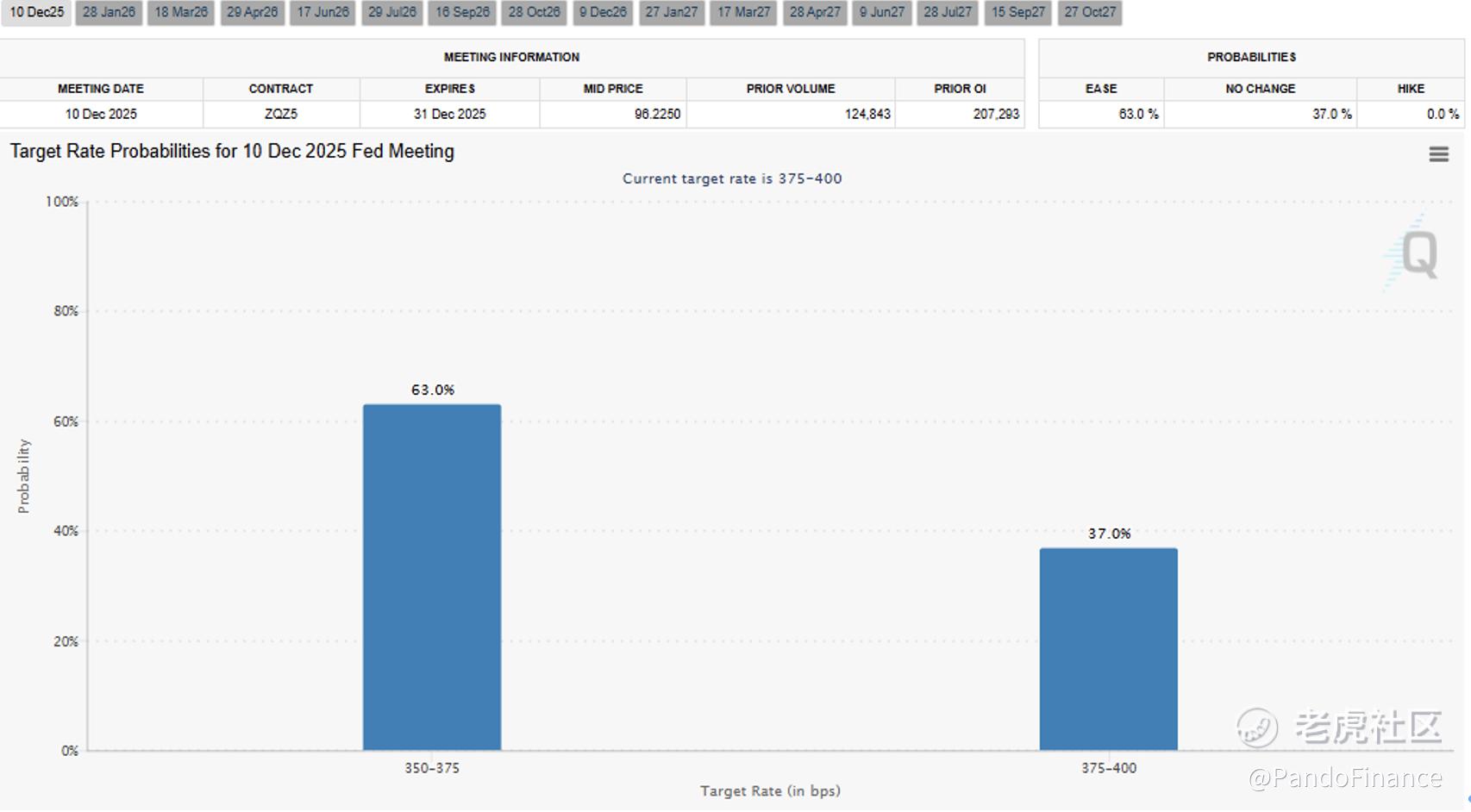 Powell 主席持续透过公开言论控管市场预期。面对市场参与者过度乐观的降息预期,他在会后记者会上明确指出,12 月会议并不一定会再度降息,并多次强调美国经济整体仍展现强劲韧性、就业市场虽有放缓但尚未出现急遽恶化迹象。此次降息行动本质上属于预防性操作,旨在提前识别并控管潜在下行风险,而非对当前经济疲弱的被动回应,借此引导市场理性定价未来政策路径,在联准会会后声明后,Fedwatch 显示市场预期12月降息机率降低至 63%,较一周前的 90% 以上大幅降低。
