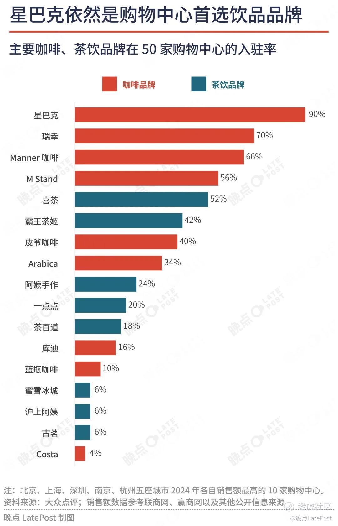 《晚点 LatePost》统计发现,星巴克依然是核心购物中心首选饮品品牌。和我们一年前的统计比较,星巴克在核心购物中心的入驻率从 82% 增加到 90%,意味着它开了更多的店。首层率维持在约 35%,并依然是入驻购物中心最多的咖啡、茶饮品牌。