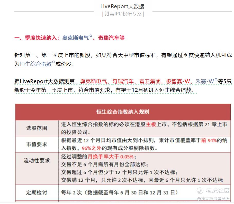 港股通纳入预测:34股有望纳入,赛力斯、奥克斯电气、奇瑞汽车将于12月初纳入,禾赛符合市值要求,有望于12月初进入恒生综合指数。
