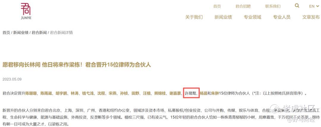 事发后两天,许晟骜的资料已被从君合官网撤下,网传其已提交辞呈。