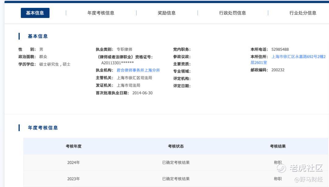 虽然已经提出辞职,但据全国律师执业诚信信息公示平台显示,目前许晟骜的执业资格依然保留在君合律师事务所上海分所。且许晟骜的简历十分干净,2020年-2024年的考核结果均为称职,无行政处罚信息、无行业处分信息。