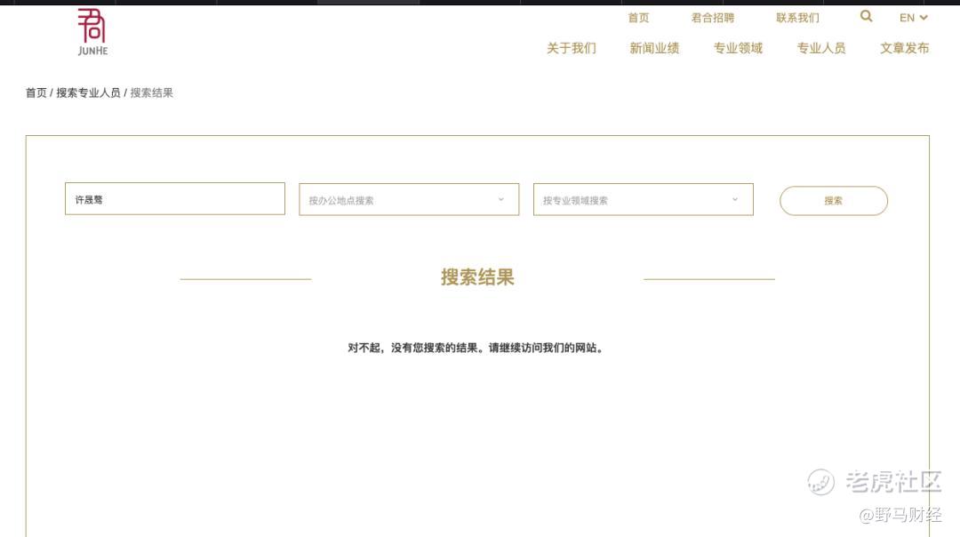 视频曝光后,君合采取了低调但迅速的行动。截至11月5日,事务所虽未发表官方声明,但其官网的合伙人介绍页面中,许晟骜的资料已被撤下,链接显示“没有您搜索的结果”。