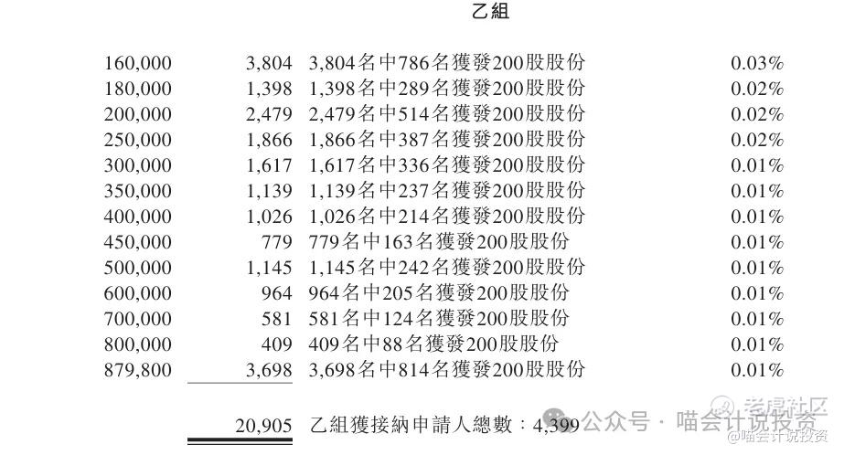 这次甲乙组的分配都是狂降,这是一种非常极端的分配方式,毫无公平性可言。极度favor甲组头部和乙组头部,也就是说在甲组和乙组内部,单手中签率狂降,导致无论你申购多少手,中签率非常接近。