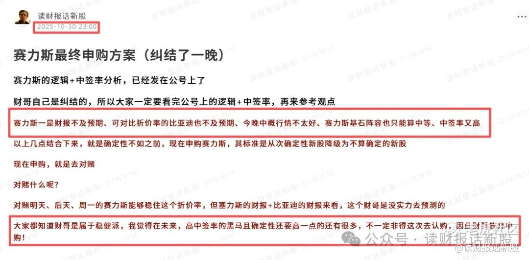 赛力斯一是财报不及预期、可对比折价率的比亚迪也不及预期、中概行情不太好、赛力斯基石阵容也只能算中等、中签率又高,因此放弃申购