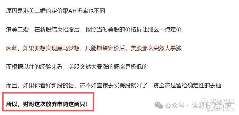 两只港美股倒是一致放弃,财哥直接发在公号上,第一天就决定放弃申购