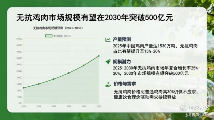 从行业来看,博研咨询发布的《2025-2030 年中国无抗养殖行业市场规模及投资前景预测分析报告》显示,无抗鸡肉市场规模有望在2030年突破500亿元,引领健康肉品消费崛起。