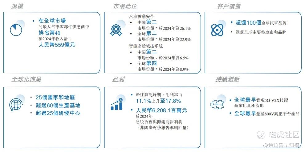 公司业务专注于汽车零部件的研发、制造和销售,于2024年全球汽车零部件行业中排名第四十一,根据弗若斯特沙利文的资料,按收入计,公司是中国和全球第二大汽车被动安全产品供货商。