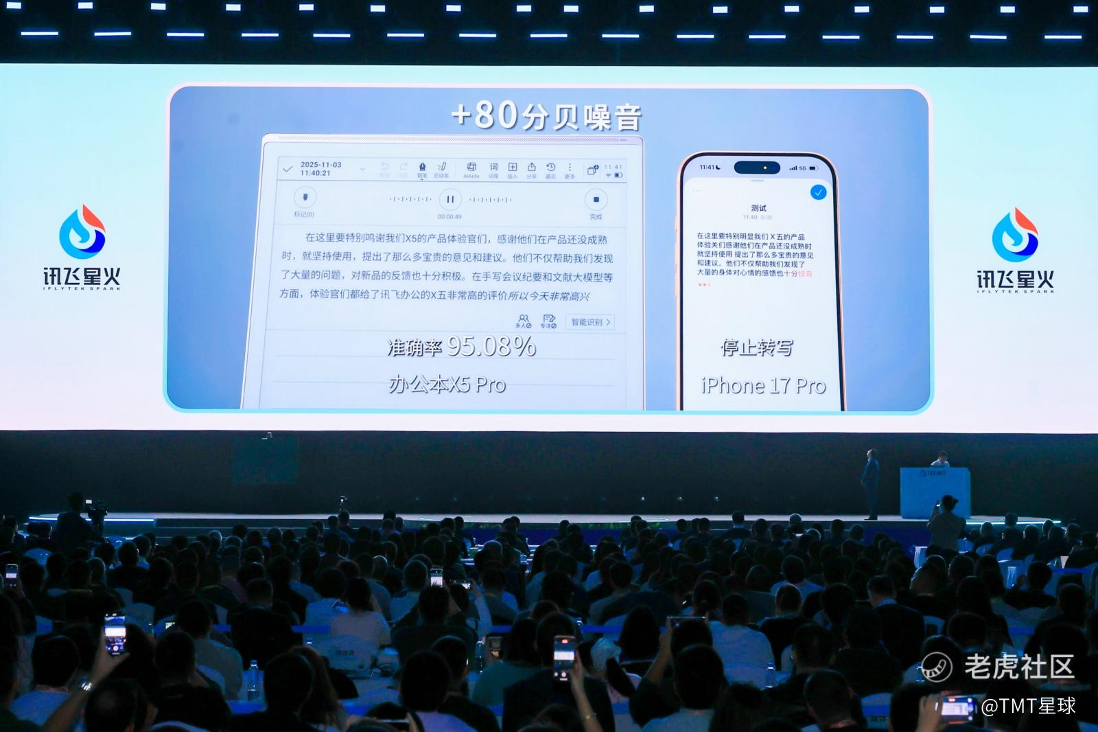 凭借独家“AI+麦克风阵列技术”,讯飞智能办公本X5通过首创的上4下4环八麦克风阵列实现超强抗噪,识别效果远超iPhone 17 Pro,高噪环境下识别准确率达95.08%;讯飞AI翻译耳机首创单耳三麦多感融合降噪系统,在复杂噪声下识别准确率高达97.1%;讯飞双屏翻译机2.0则独创强降噪模式,在90dB噪音下识别率达98.69%。此外,业界首个软硬一体的讯飞同传麦克风能实现自动翻译免切换,同传播报首响延迟低于2s,支持私有化部署。