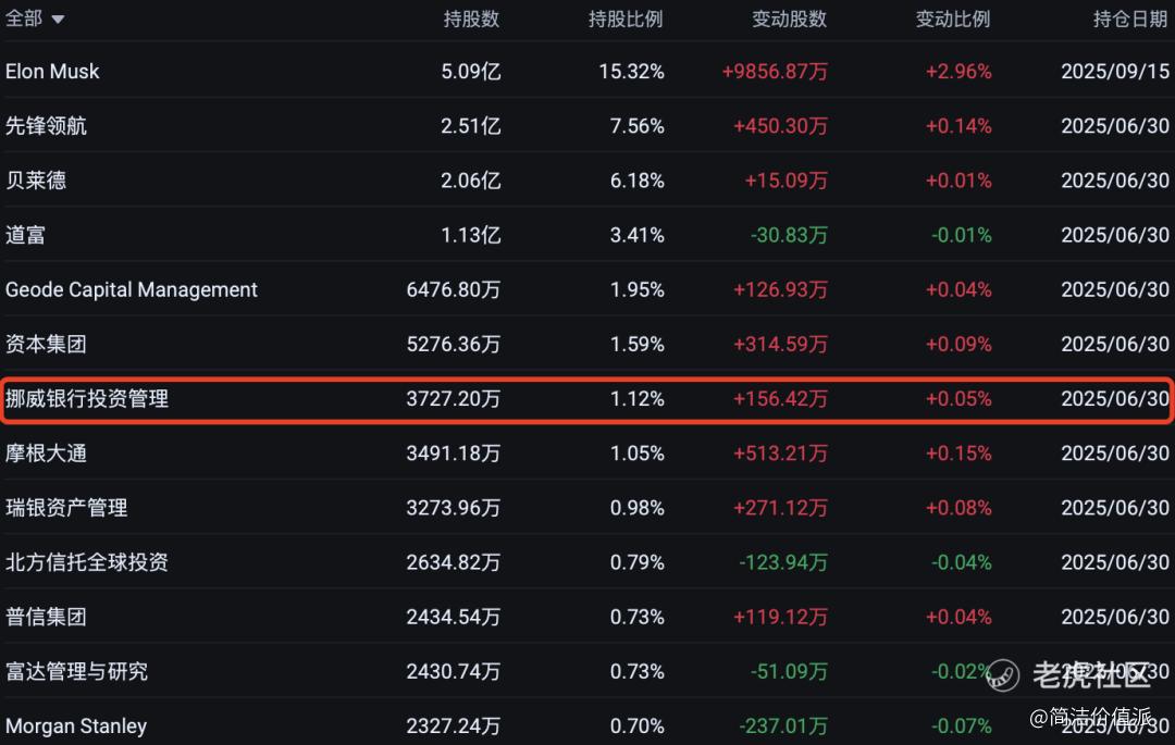 (挪威主权财富基金持有特斯拉约1.2%股份,位列第七大股东)