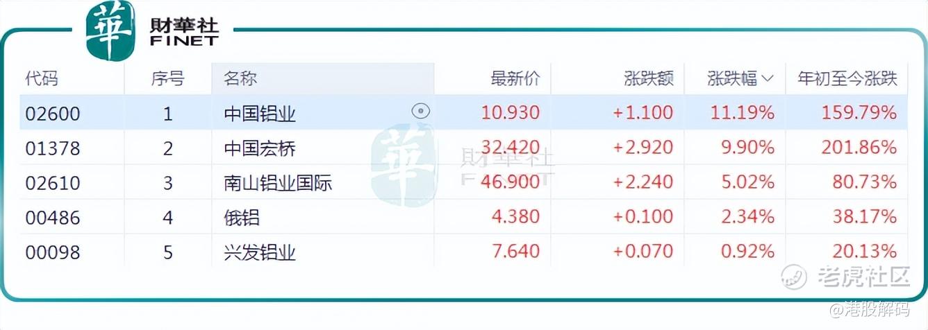 截至收盘, $中国铝业(02600)$ 大涨11.19%, $中国宏桥(01378)$ 涨9.9%, $南山铝业国际(02610)$ 涨5.02%,俄铝(00486.HK)涨2.34%,兴发铝业(00098.HK)跟涨。
