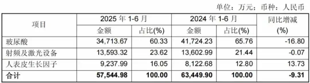 在半年报中,昊海生物科技披露了其分部业务的增长情况。从收入结构上来看,医美业务收入为 5.75 亿元,占总营收的 44.35%,是公司第一大收入来源。其中,玻尿酸产品收入 3.47 亿元,同比下降 16.80%,主要受子公司其胜生物产品增值税率调整影响;人表皮生长因子产品收入 9237.99 万元,同比增长 13.73%。