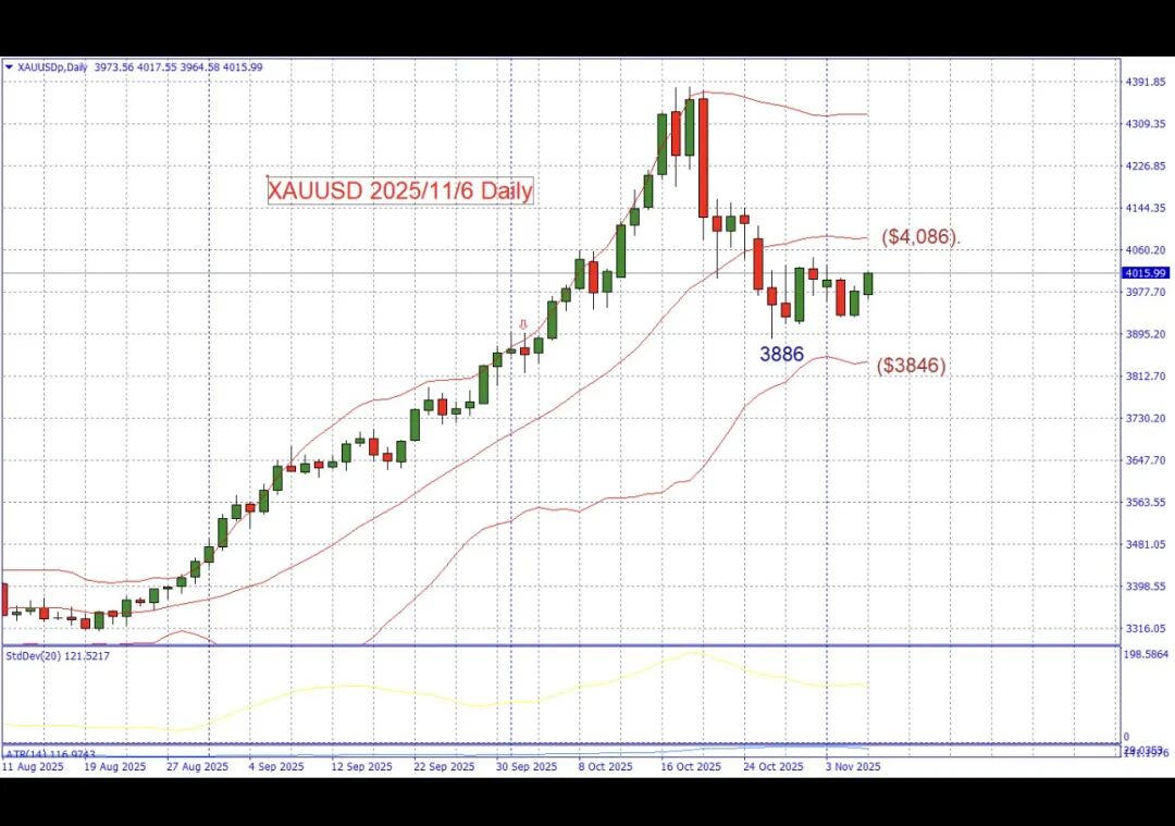 →略有双底模样,但需要看到黄金突破布林带中轨线$4086,才能确认重回上升趋势。