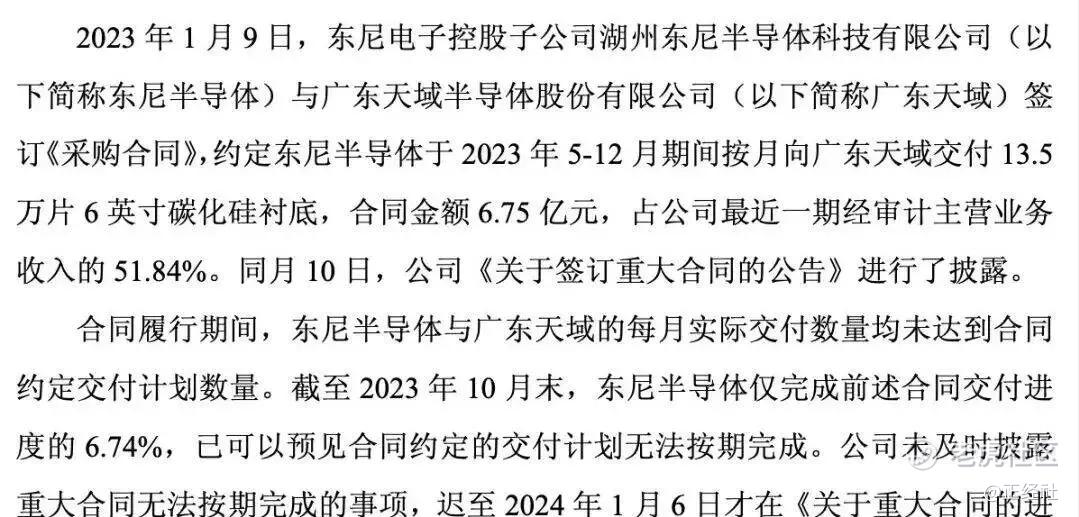 一是跟广东天域签订的价值6.75亿元的碳化硅衬底采购合同,实际交付进度仅完成6.74%,却延迟3个月披露,导致公司计提1.66亿元损失;
