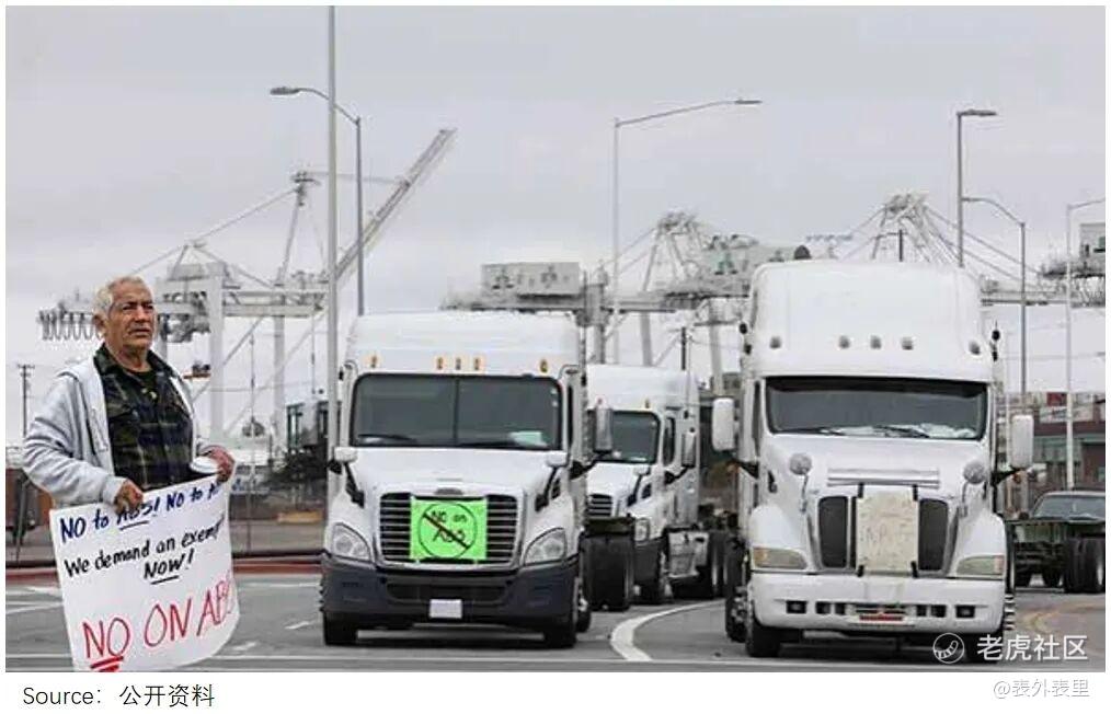 上百名美国卡车司机罢工,堵在码头门口,抗议AB5法案的实行,并最终推动一条允许Uber们“作弊”的提案出台。