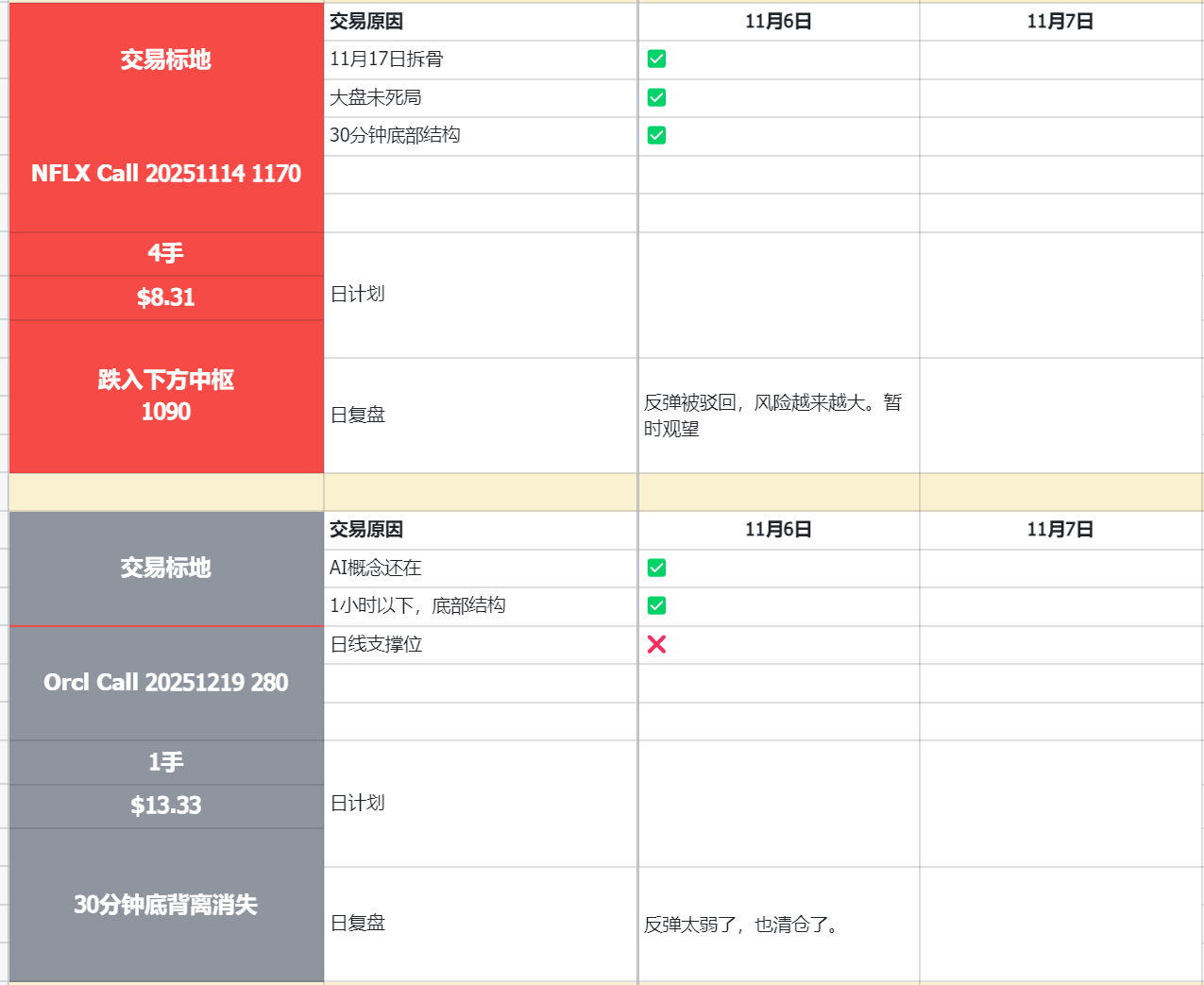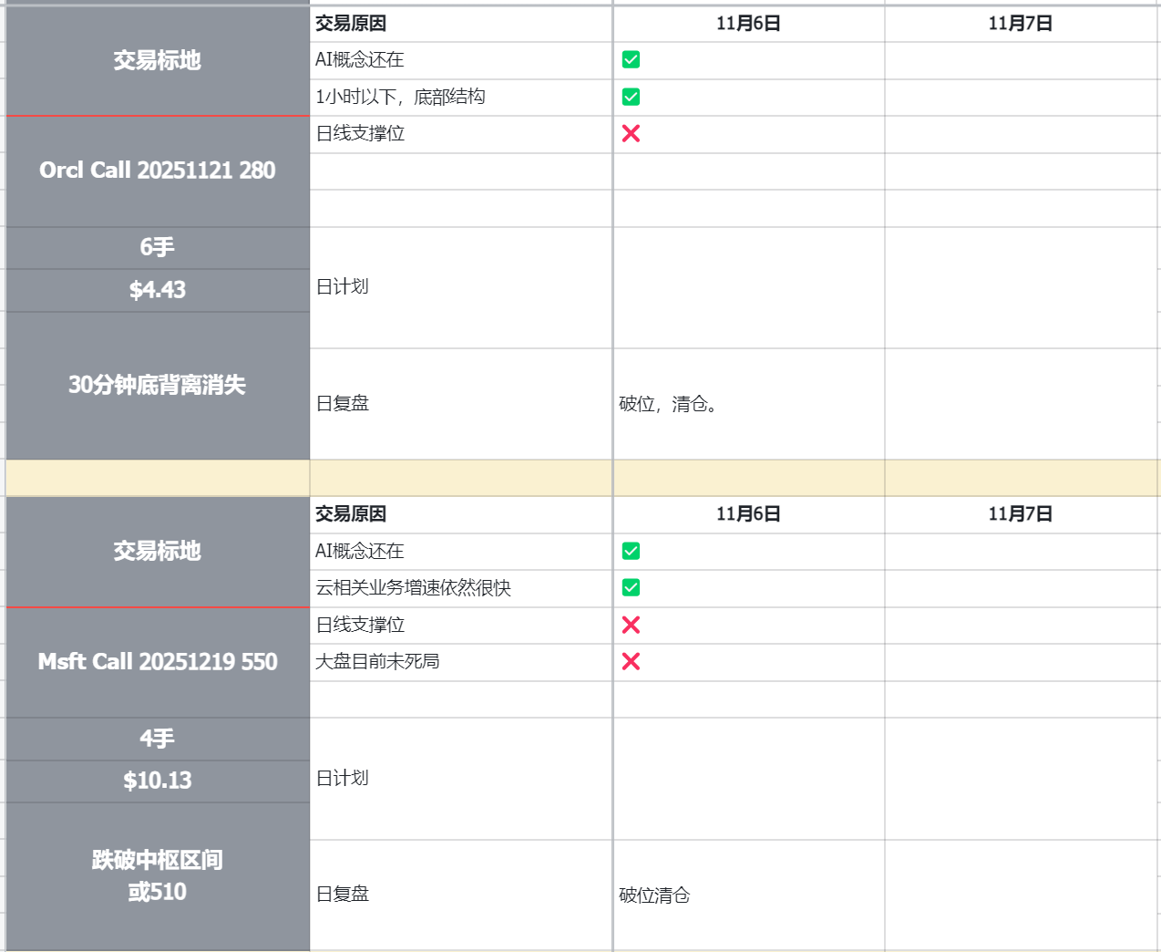 这两个标的的建仓有很强的抄底心理,这是我后续需要警惕和改进的地方。我重新查看了当时的K线,微软的入场时间存在问题,当走势不如预期时,我没有及时离场。而甲骨文的入场没有问题,但在破位后应该及时撤离,止损做得不够。当甲骨文反弹趋势较弱时,我也没有果断撤离,这个问题比较大。
