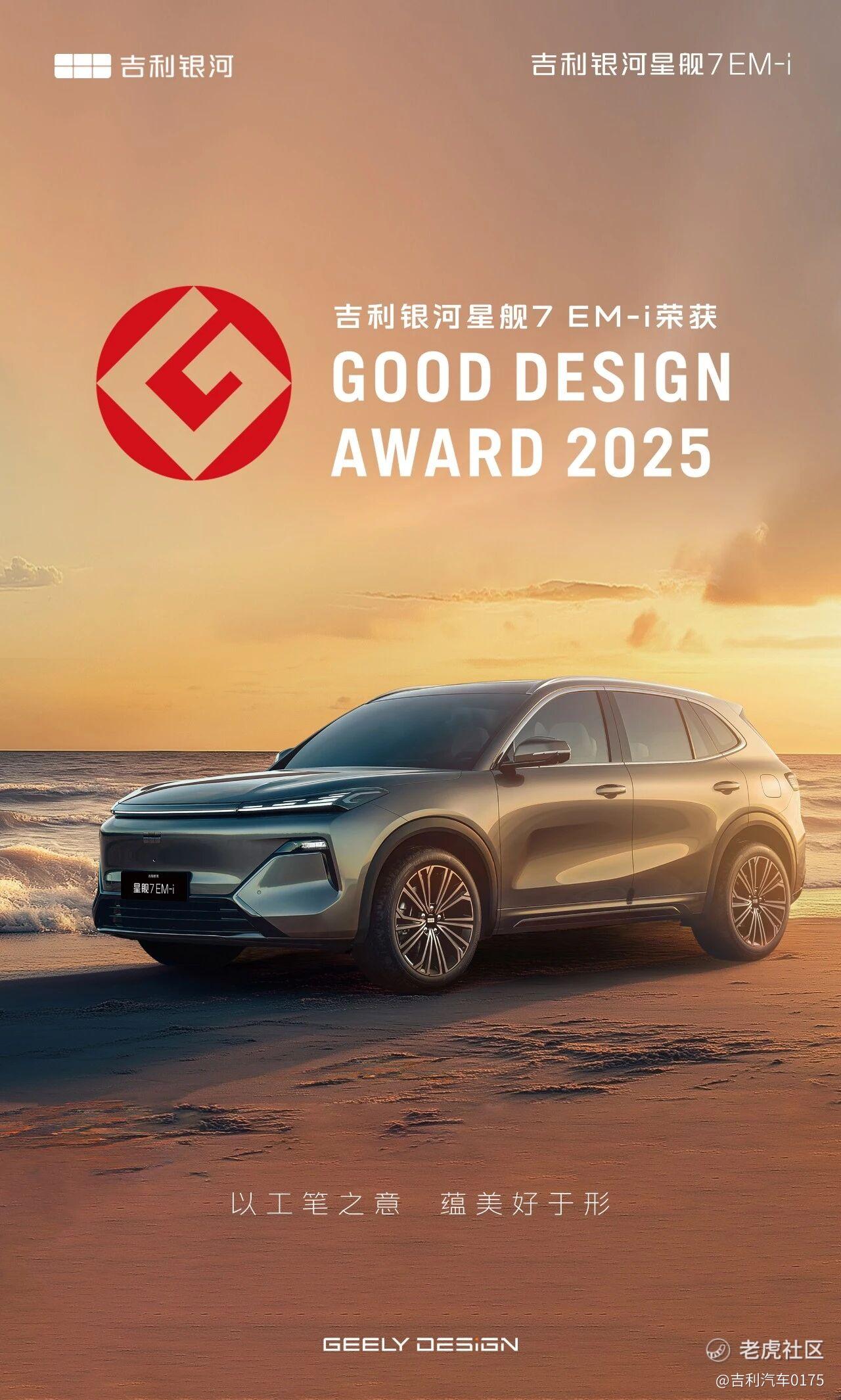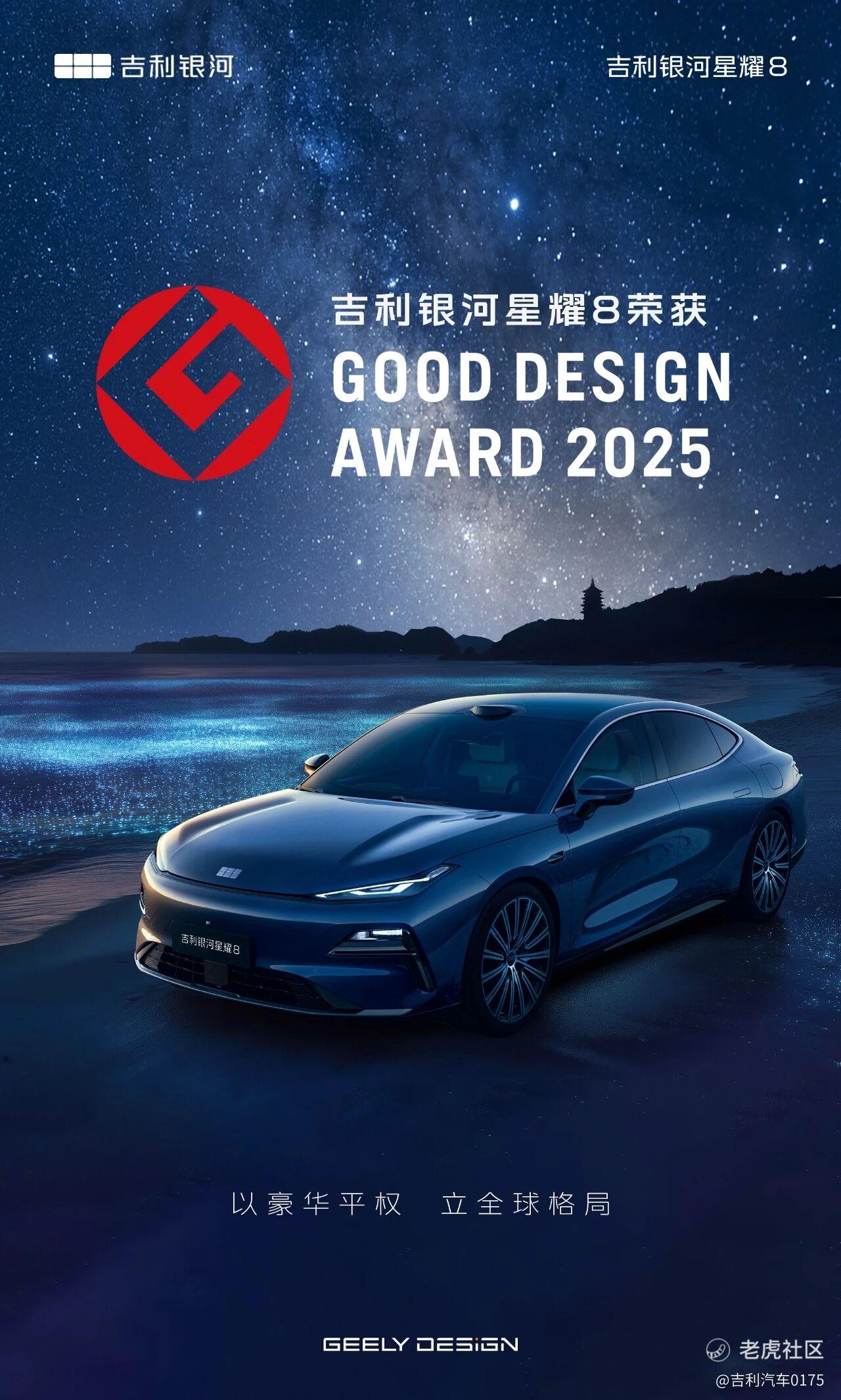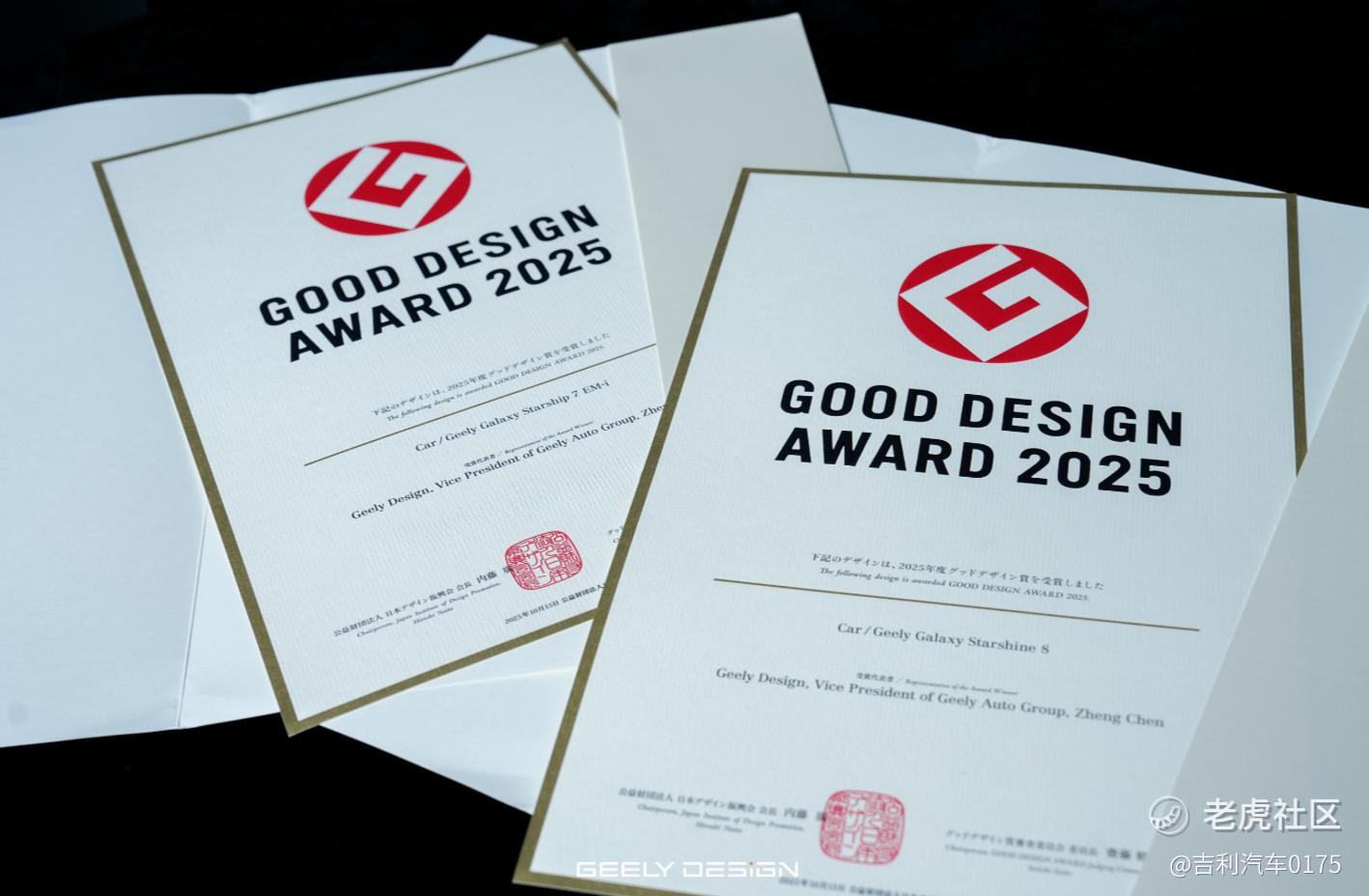 2025年度GOOD DESIGN AWARD设计大奖结果揭晓,吉利银河星耀8与吉利银河星舰7 EM-i双双荣膺殊荣,以设计语言传递跨越地域的美学共识,见证中国设计从容走向世界的坚定步伐。