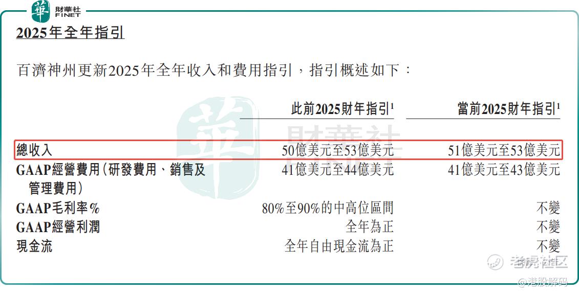 百济神州预期全年总收入将在51亿美元至53亿美元区间,此前的财年指引为50亿美元至53亿美元;百济神州还预期GAAP经营费用为41亿美元至43亿美元,此前的指引为41亿美元至44亿美元。