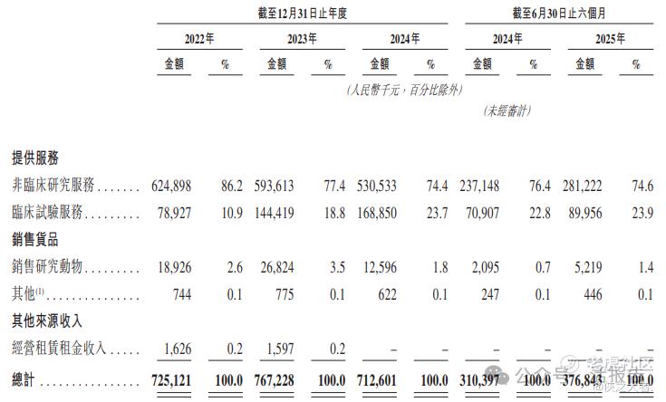 公司的收入来源主要包括(i)非临床研究服务、(ii)临床试验服务及(iii)销售研究动物,绝大部分收入来自提供非临床及临床服务。