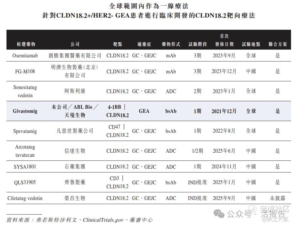 公司的核心产品givastomig是一种新型双特异性抗体(「bsAb」),可同时靶向主要表达于胃癌、食管癌及胰腺癌的肿瘤抗原Claudin18.2(「CLDN18.2」),以及T细胞共刺激分子4-1BB。