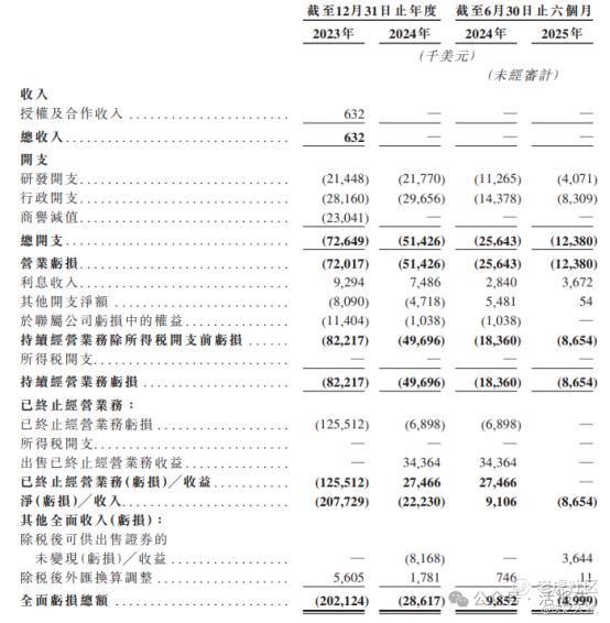 公司是一家临床阶段生物制药公司,2023年收入63.2万美元,截至2024年12月31日止年度以及截至2024年及2025年6月30日止六个月未产生收入。