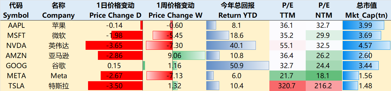 大科技本周在财报后继续走出分化行情,芯片回调,而GOOGL则连涨数周。至11月6日收盘,过去一周 $苹果(AAPL)$ -0.6%, $微软(MSFT)$ -5.45%, $英伟达(NVDA)$ -7.3%, $亚马逊(AMZN)$ +9.06%, $谷歌(GOOG)$ $谷歌A(GOOGL)$ +1.16%, $Meta Platforms, Inc.(META)$ -7.13%, $特斯拉(TSLA)$ +1.32%