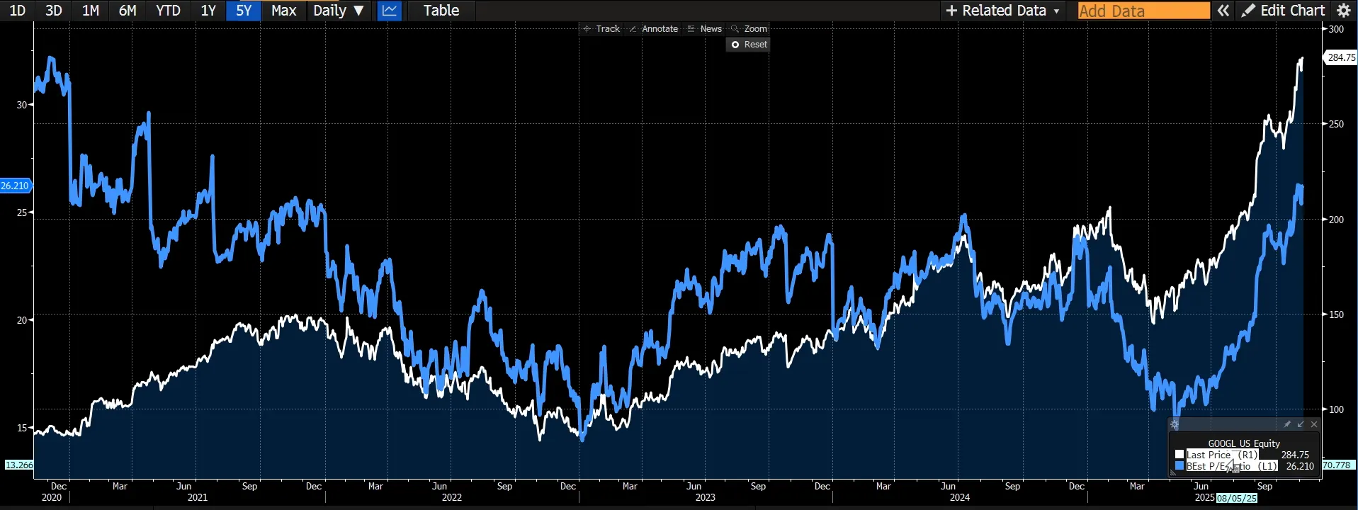 从目前估值来看,Google的股价虽然已经创下历史新高,但从估值上来看,也仅在2022年初的水平(Forward PE)。假设搜索收入务实增长、Cloud加速的情形落地,且AI新品增强长期增长耐久性得到验证,以2027年EBITDA(考虑折旧摊销可能会畸形),以16倍的基准,可以对应330的目标价。