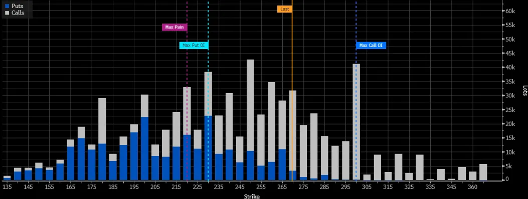 从期权方面看,目前的现价已经高于最大痛点较多,未来一个月的期权水平仍偏谨慎。不过观察12月当月,300价位上也出现了最大量的未平仓Call,250-270的整体量也相当多,年内大概率仍以波动行情为主。