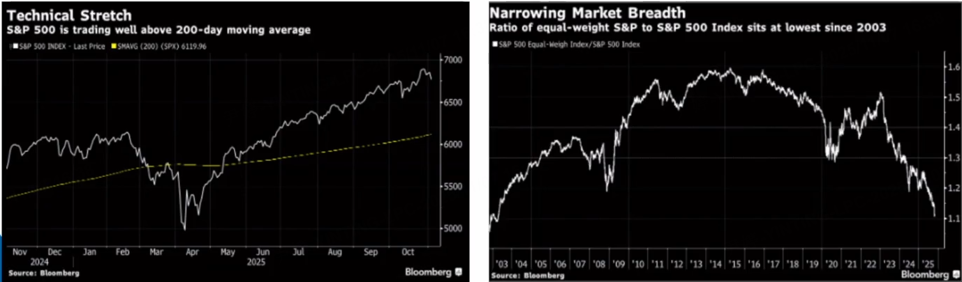 市场的领头羊过于集中,过度依赖少数几家市值巨大的科技公司支撑涨势,AI叙事若有任何风吹草动,市场很容易受到影响。