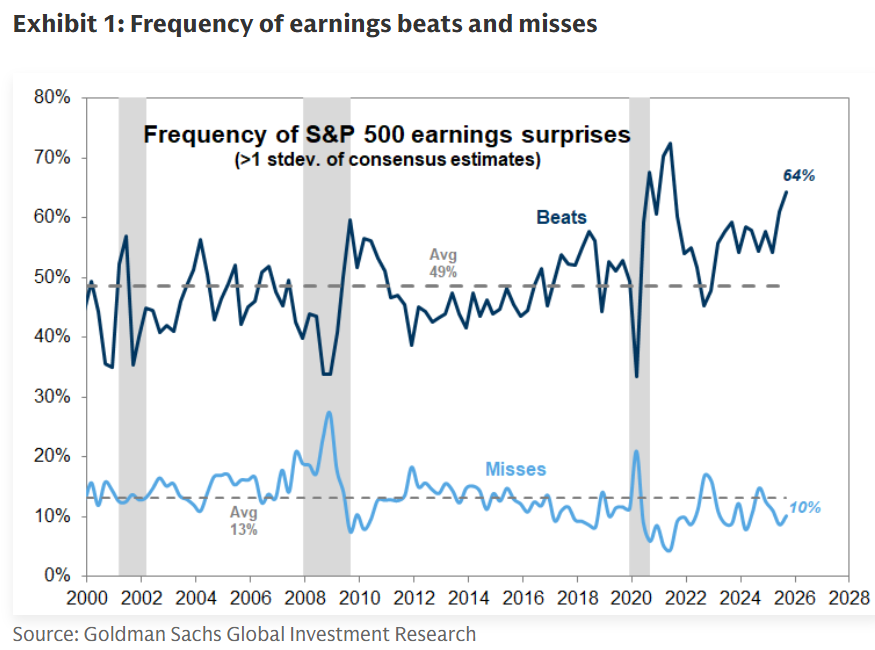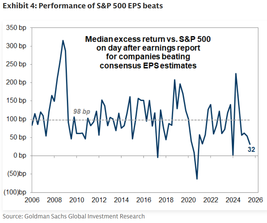财报发布次日,获利超预期股票的中位数仅跑赢标普 500 指数 32 个基点;相较之下,该类股票在这一节点的历史平均跑赢幅度可达98 个基点。