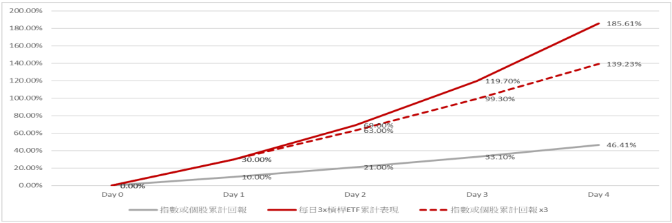 复利计算的应用 : 每日 3 倍杠杆 ETF – 当市场走势有明显的上涨趋势时