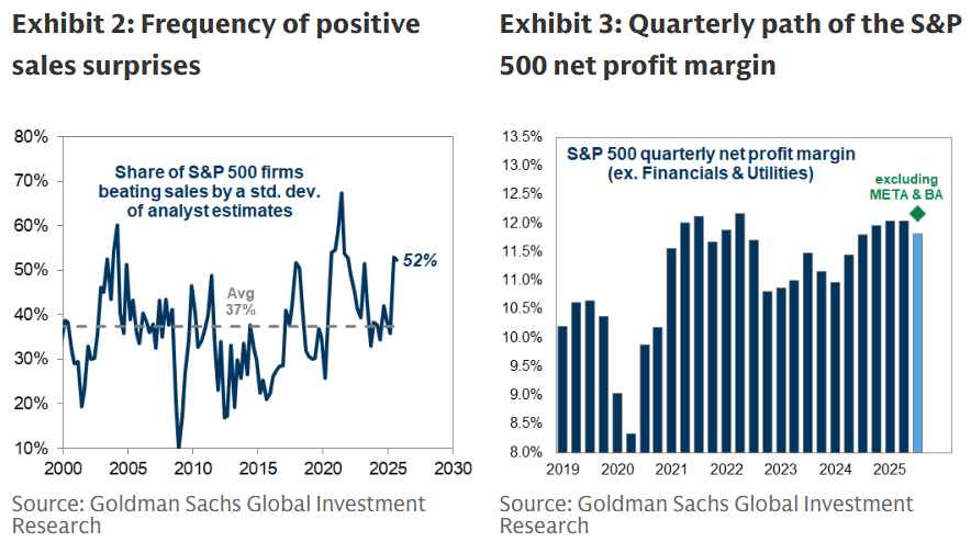标普 500 指数成分股公司较去年同期销售成长 6%,高于财报季开始时市场普遍预期的 4%。 52%的公司销售额超过市场预期,而历史长期均值为 37%。 虽然标普 500 指数净利率预计为 11.8%,较第二季下降 21 个基点,但若剔除受一次性非现金支出影响的 META 和 BA 的业绩,利润率环比将增长 12 个基点。