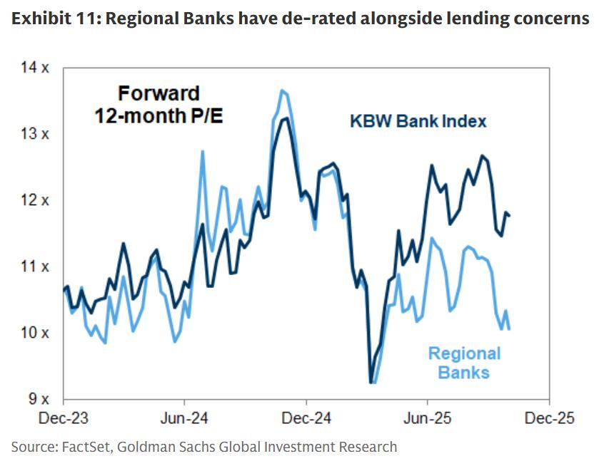 高盛的股票分析师和信贷策略师认为,近期出现的贷款损失属于个别情况,而非系统性风险的征兆。然而,我们的股票分析师认为,考虑到杠杆特征和抵押品,非金融机构贷款的预期损失率应该较低。