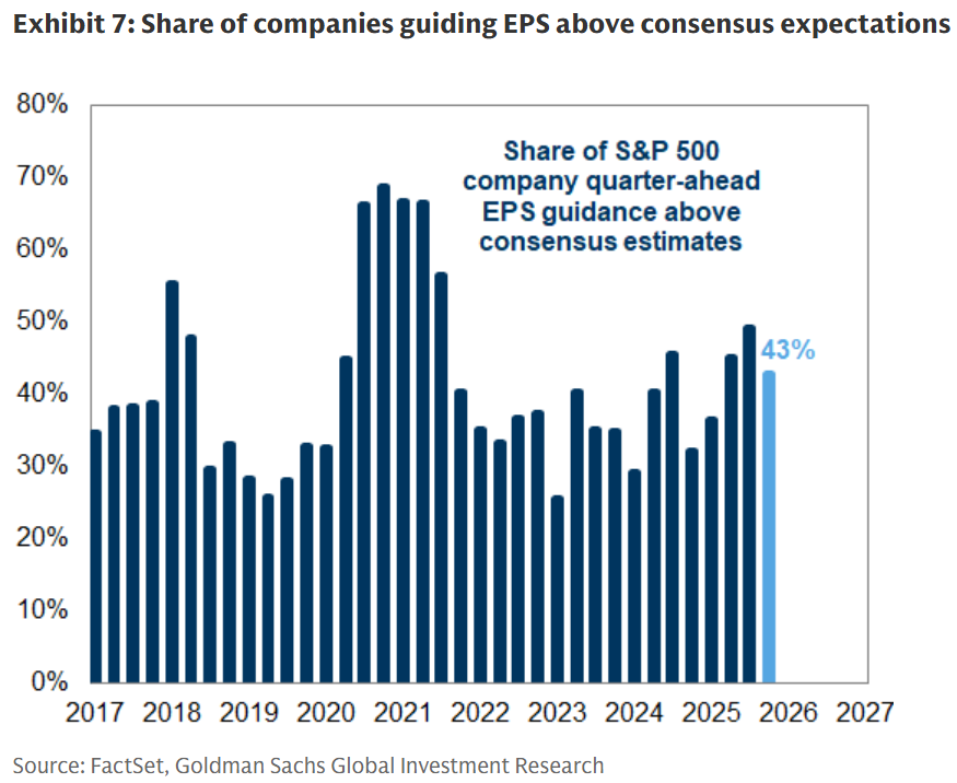 除了强劲的往期每股盈余数据外,迄今为止的公司指引表明,企业对近期获利前景依然保持乐观。目前,已有 49 家公司发布了第四季获利指引。 其中,43%的公司预计下一季每股收益将高于市场普遍预期,高于过去十年 40%的季度平均值。
