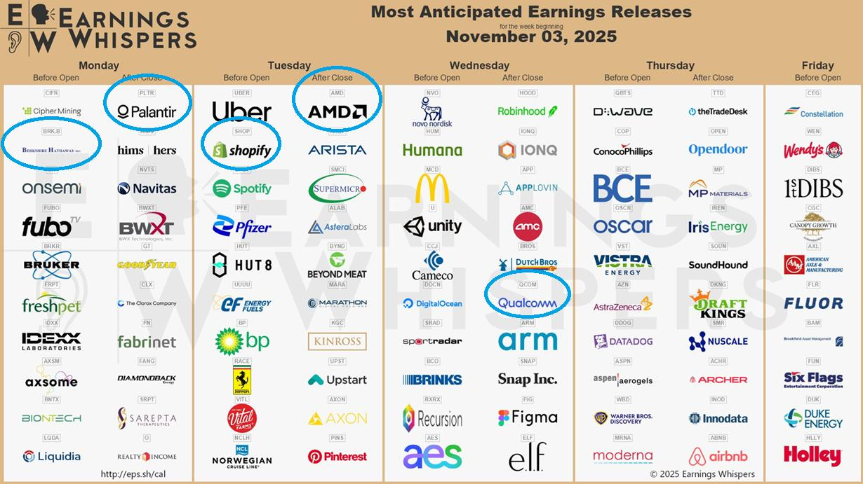 截至目前, $标普500(.SPX)$ 指数成分股公司中已有317家公布了2025年第三季度财报,这些公司占总市值的69%,上周是Q3财报季发布规模最大的一周,共有174家公司发布了财报,其中 $英伟达(NVDA)$ 是该指数中市值最大的公司,将于11月19日发布财报。