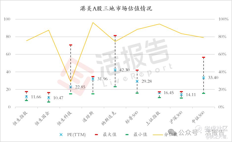 截至10月底,恒指、国指、恒科的PE估值分别为11.66x、10.47x、22.85x,分别位于近十年75.41%、87.64%、28.65%的历史分位,但仍处于全球主要指数中的偏低水平。