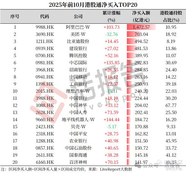 今年前10月,港股通净买入最多的个股包括阿里巴巴-W、美团-W、比亚迪股份、建设银行、腾讯控股、中芯国际等,其中净买入阿里巴巴近1500亿港元,净买入美团超700亿港元。