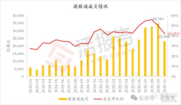 南向资金方面,近一年来港股通渠道成为港股市场交易的主力军。前10月港股通累计成交近25万亿港元,同比增长近两倍,占大市成交比例达到47.2%,10月份港股通成交占比有所回落,降至42%。