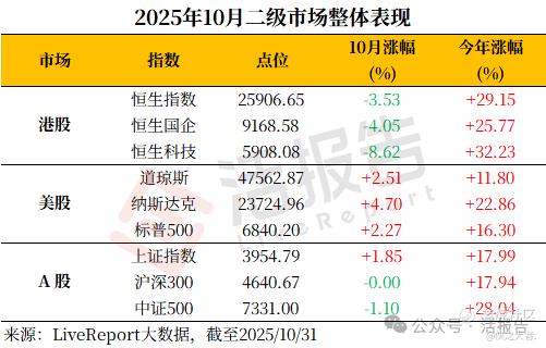 2025年前10月,港股市场的恒指、国指、恒科分别上涨了29%、26%、32%,尽管主要指数近一个月有所回调,结束了月线五连升的势头,但港股市场的整体表现仍在全球主要股市中名列前茅。