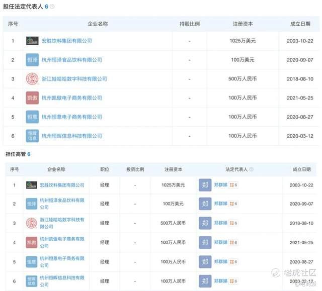 天眼查信息显示,郑群娣共在6家娃哈哈相关公司担任法定代表人,包括宏胜饮料集团和杭州恒泽食品饮料有限公司、杭州恒意电子商务有限公司等4家宏胜系公司,以及浙江娃哈哈数字科技有限公司法定代表人,该公司股权穿透后,实控人为宗馥莉。