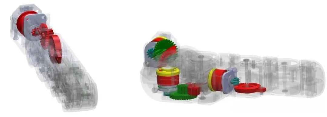 齿轮传动则主要靠驱动器通过齿轮或蜗轮蜗杆将旋转变成直线运动,拉动驱动器和手指之间的弹簧来驱动手指产生动作,手指部分采用金属连接,各个手指动作相互独立。其优点是传动精准、反应迅速,齿轮可以和电机紧密配合,实现每个关节的独立精准控制,甚至能做到“力反馈”,从而更好地抵抗冲击;而劣势是结构冗杂,笨重——精密的齿轮结构往往意味着重量的增加。
