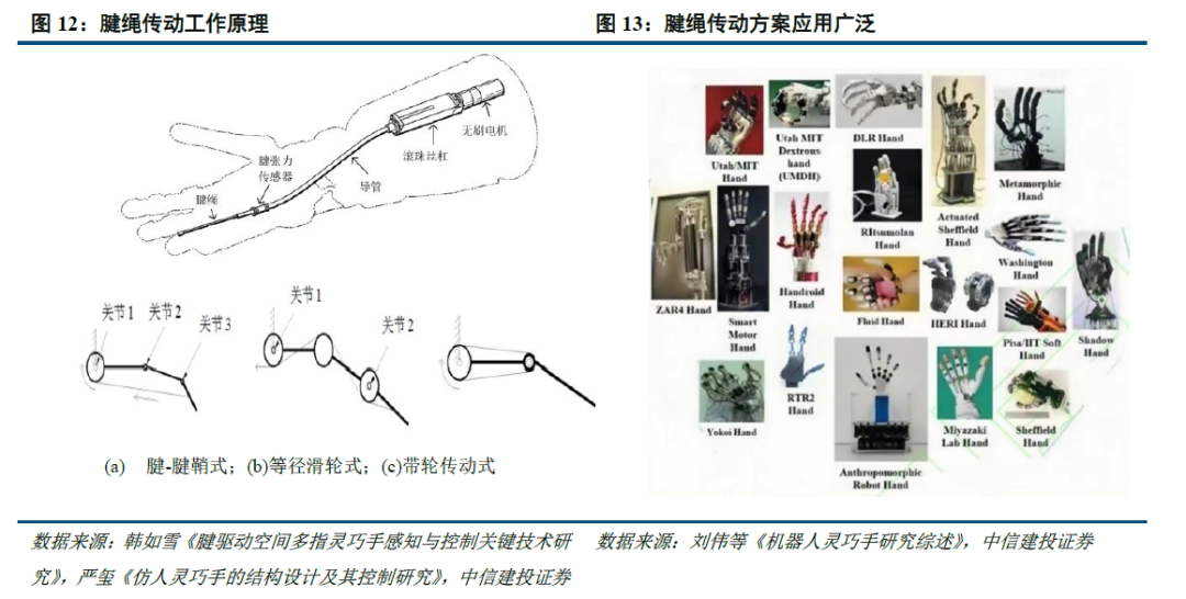 目前,主流的灵巧手传动方案有三种:连杆、齿轮和腱绳。