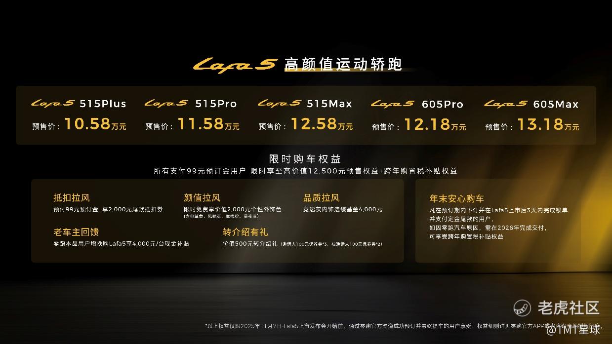 预售权益方面,2025年11月7日至零跑Lafa5上市发布会前,预付99元预订金,限时享至高价值12500元预售权益+跨年购置税补贴权益,具体权益如下: