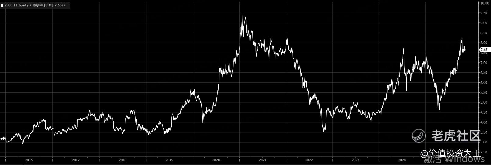从市净率估值上看,台积电当前为7.7倍,没有2021年半导体牛市高点时高,但也处于近10年来相对较高位置: